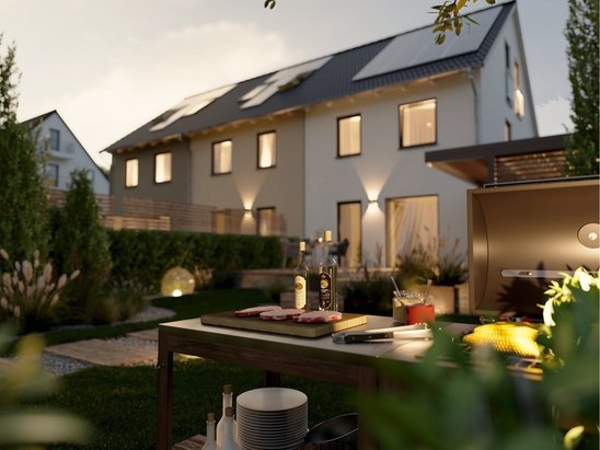 Beim Doppelhaus teilen sich zwei Haushalte eine gemeinsame Wand. Die Grundstückskosten und Baukosten lassen sich dadurch deutlich senken.