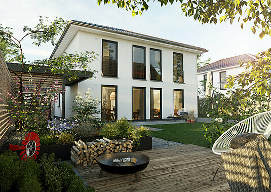 Von außen überzeugt die Stadtvilla 145 mit ihrer modernen Architektur. Denn die bodentiefen Fenster offenbaren das helle Ambiente des Massivhauses und laden zu gemütlichen Familienabenden ein. Der geräumige Wohn- und Essbereich stellt das Herzstück des Hauses dar und bietet direkten Zugang zur halboffenen Küche. Besonders beliebt sind großen Fensterflächen sowie die zweiflügelige Glastür zum Wohnbereich, die die ganze Stadtvilla 145 mit Licht durchfluten.