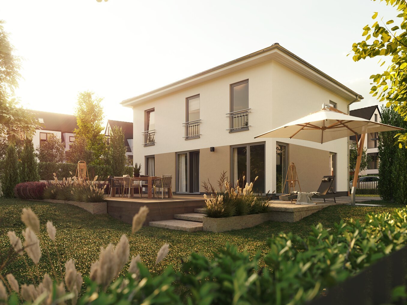 Eine Stadtvilla punktet vor allem mit einer optimalen Raumnutzung und einem besonders hohen Wohnkomfort. Dank ihrer zwei vollwertigen Geschosse bietet sie großzügige Wohnflächen ohne Einschränkungen durch Dachschrägen. Zudem benötigt eine Stadtvilla im Vergleich zu einem Einfamilienhaus weniger Grundstücksfläche, bietet jedoch eine ähnlich hohe Privatsphäre.